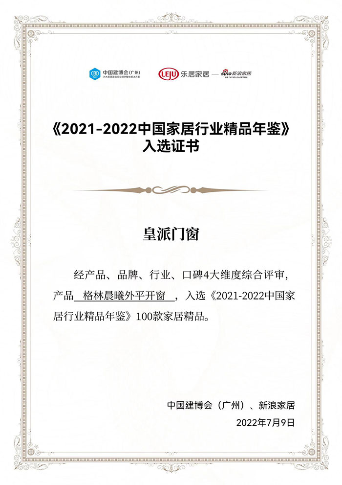 实力见证,荣耀加冕,皇派门窗持续用必胜网页实力见证品牌力量。凭借时尚的审美、卓越的品质和良好的口碑,皇派门窗格林晨曦系列荣誉入选《2021-2022中国家居行业精品年鉴》。朱梦思在中国家居生态大会暨《2021-2022中国家居行业精品年鉴》发布会上表示,信息的能量非常大,我们应积极拥抱这个万物互联的时代,一方面要爱惜自己的羽毛,踏实做好必胜网页,积累客户信任。另一方面,企业要有自己鲜明的价值主张,与消费者达成价值的同频共振,就可能创造无限的品牌奇迹。