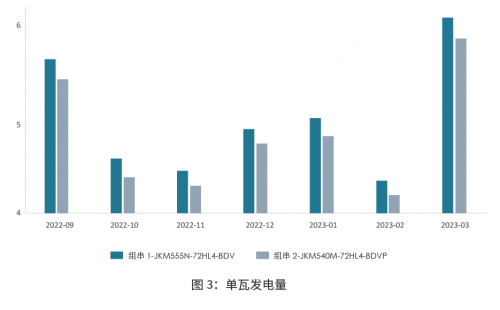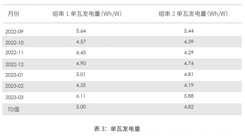 2022年9月-2023年3月测量的月度发电增益,并根据公式1计算得出两个组串的单瓦发电量(Wh/W),其结果如表3和图3所示:
