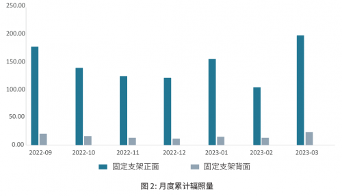 2022年9月-2023年3月测得的组件正面、背面累计辐照量、反射率数据,结果如表2和图2所示: