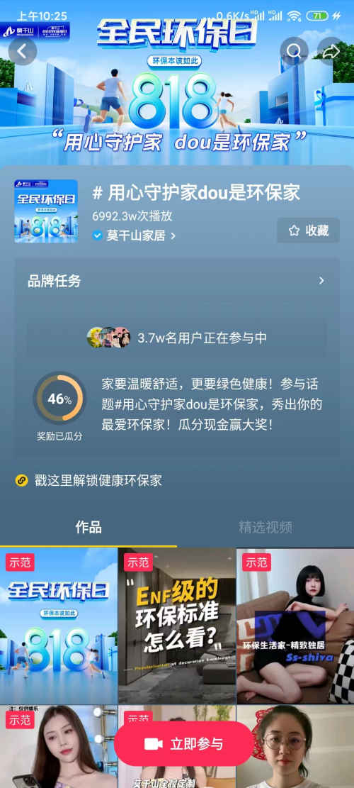 活动期间,@设计师棒棒、@小爱嘶S、@欧克宝宝、@泡芙等抖音百万粉大V倾情种草,材质和环保哪个更重要?家居环境影响健康怎么办?莫干山环保家居实力强展现,推进全民ENF环保认知,助力活动引爆全民参与热潮,8月21日,话题视频播放量突破6000万!参与人次超3万!引发国民级讨论热度!活动持续火热!