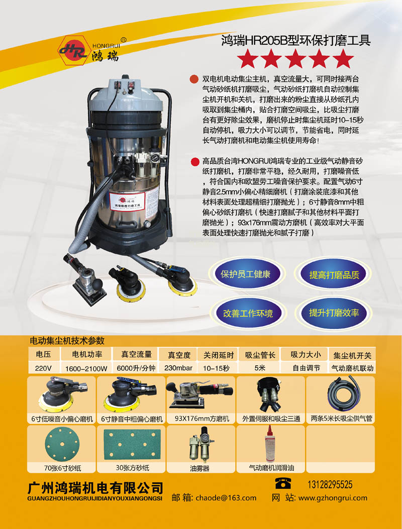 3、台湾鸿瑞高品质工业级气动砂纸打磨机,经久耐用,新型专利吸尘结构,吸尘效果更好,静音打磨机打磨时耗气少,噪音低,符合国内和欧盟劳工噪音保护要求;方磨机和6寸磨机研磨力都强,双手压下磨机不会停转