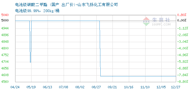 04月25日国产关于碳酸二甲酯的报价为5400元/吨。碳酸二甲酯的规格:电池级99.99%,200kg/桶。该报价有效期为3天。报价提供方:山东飞扬化工有限公司。 拓展浏览资讯: