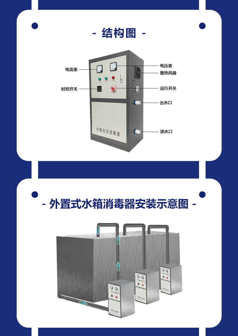 水箱自洁消毒器由电控柜和循环水缸两部分组成,电控柜为潜水泵等电源部分的控制系统,循环水缸中有潜水泵、吸水管、布水器、曝气部分组成,两者之间由管路及电缆连接。