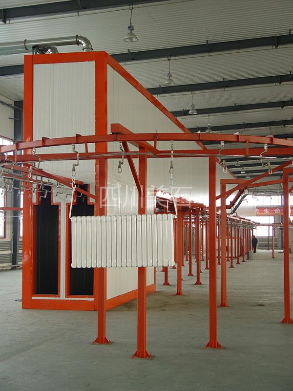 喷塑流水线主要配套设备:悬挂链输送设备,不锈钢喷淋清洗剂,脱水烘干炉,喷房,自动喷涂机,升降机,隔离房,燃烧室,固化烘干炉,废气处理设备,废水处理设备等。